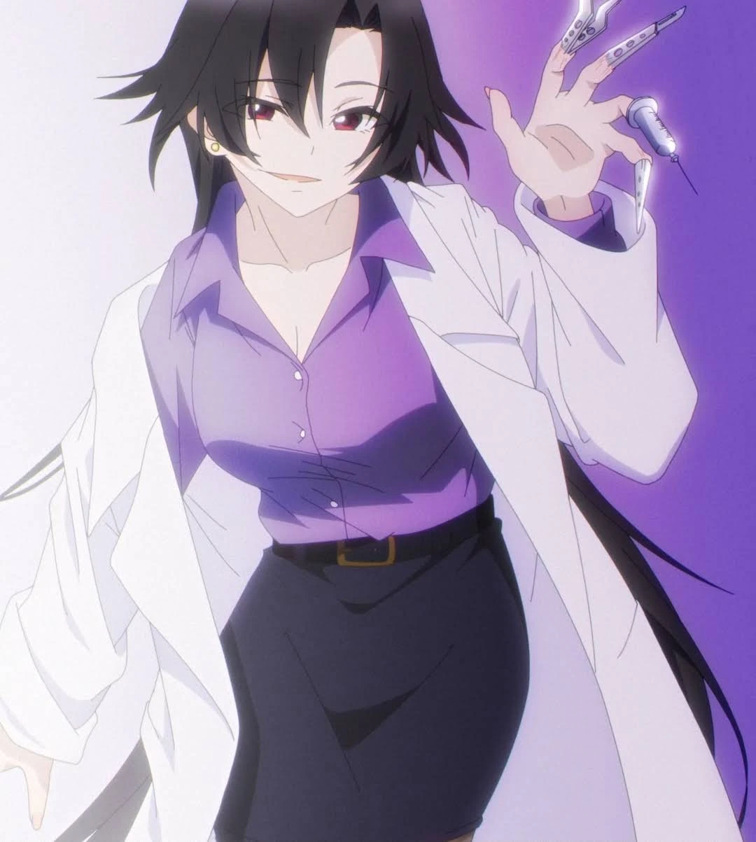 She wears a white lab coat, a light-blue collar shirt that exposes half of her chest, a short black pencil skirt, dark-colored stockings and black heels.